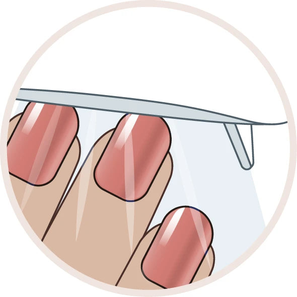 Although the instructions state that you stick on the nail and then trim and file before putting under the UV/LED lamp, I found that they are too flexible to do this effectively at this stage. Instead I would suggest sticking them on, firming them down - THEN put them under the UV/LED lamp for at least 60sec to set the gel. After this time they can be trimmed to size with nail clippers and filed into shape.